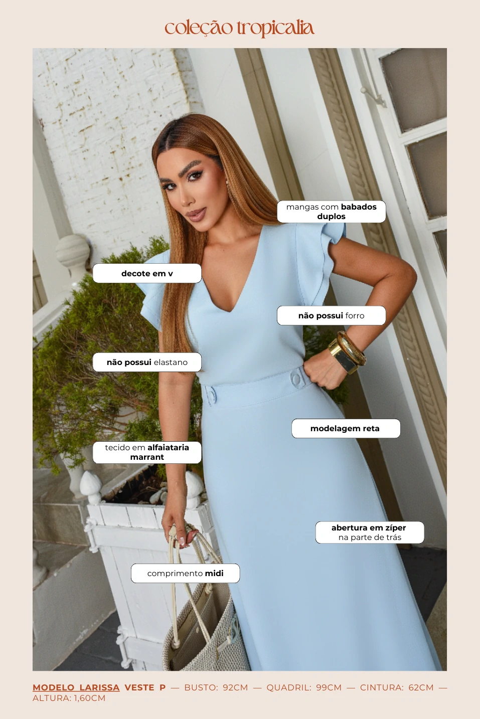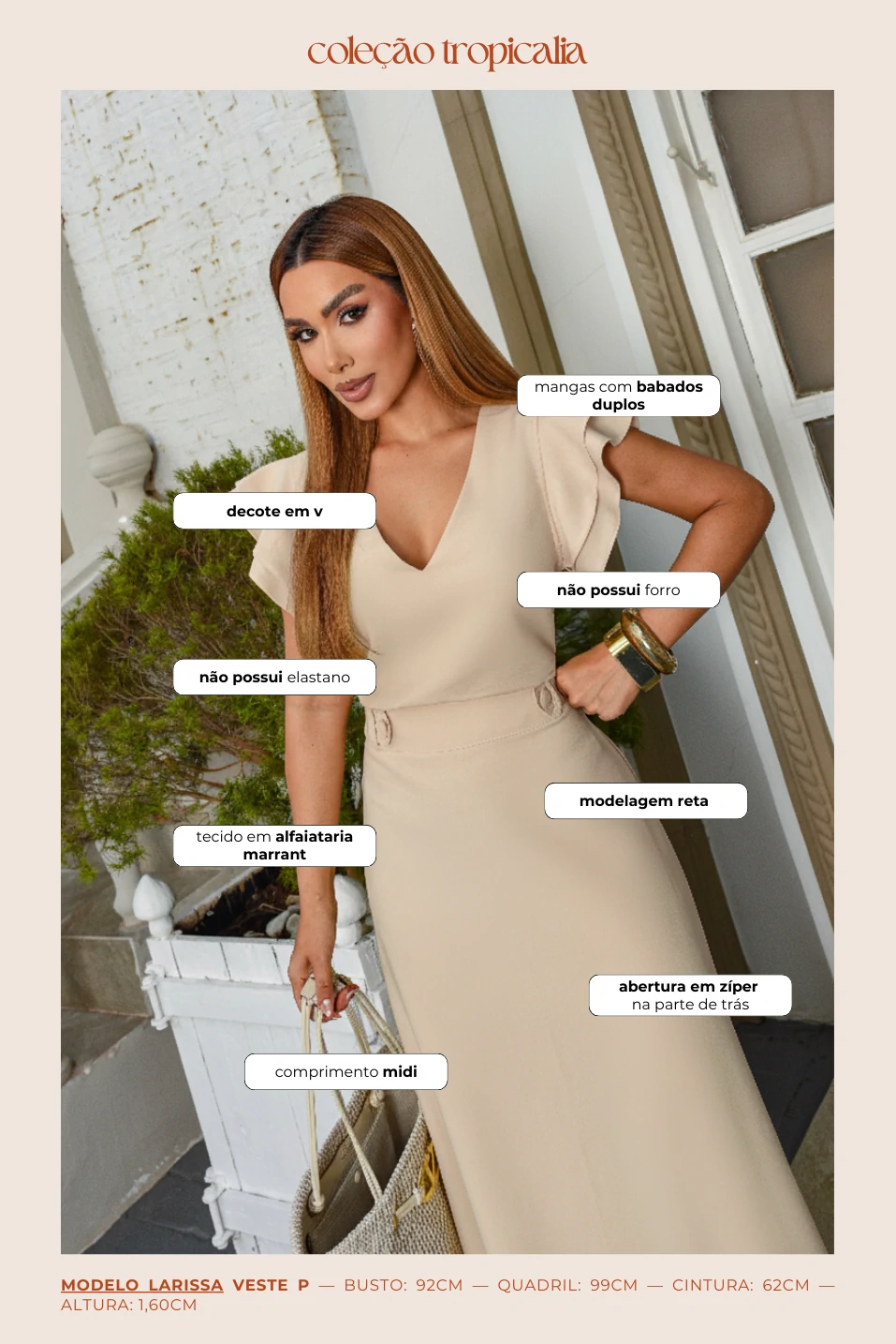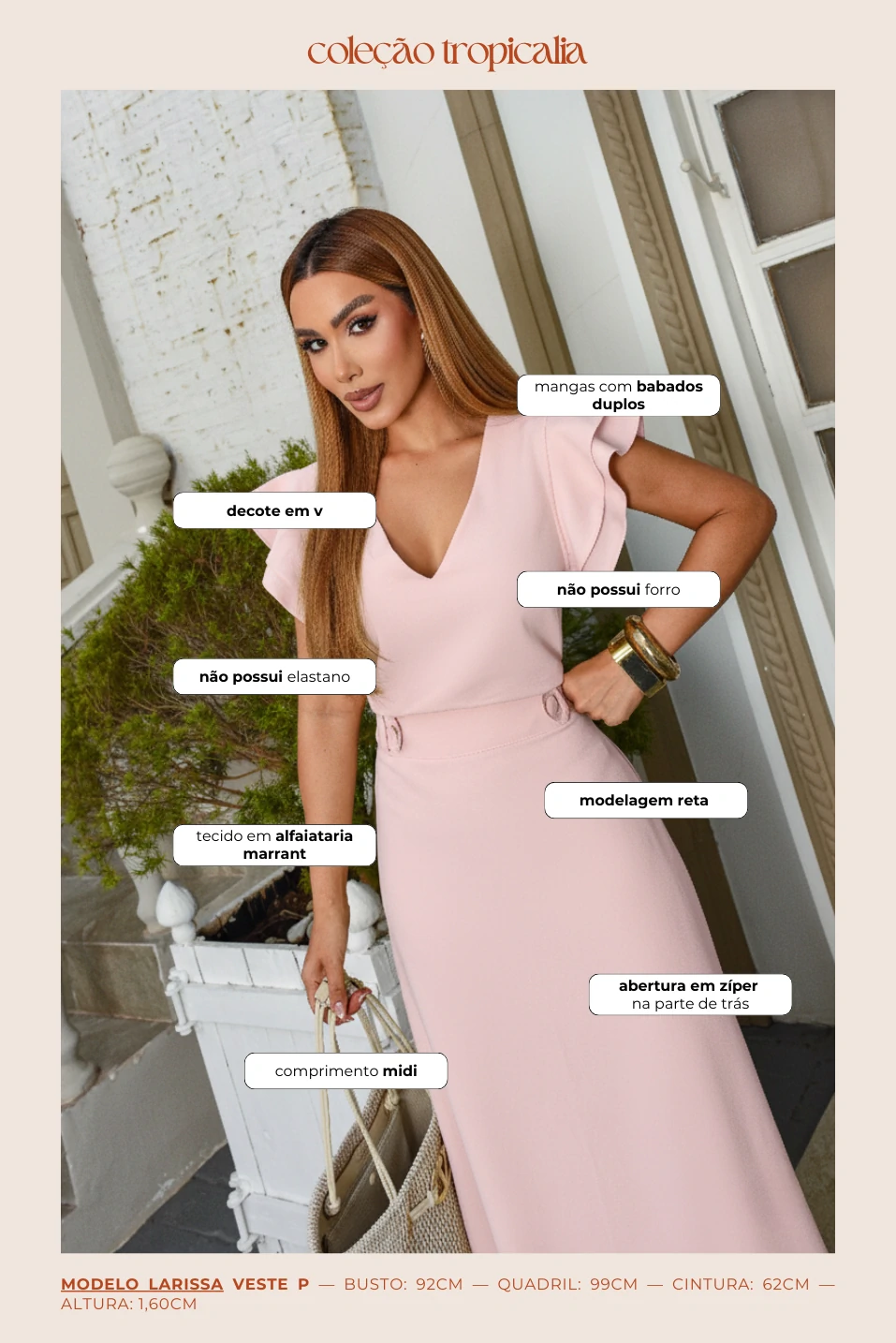 • Detalhe de fivela no cós da saia embutido na mesma cor, acentuando a cintura com delicadeza