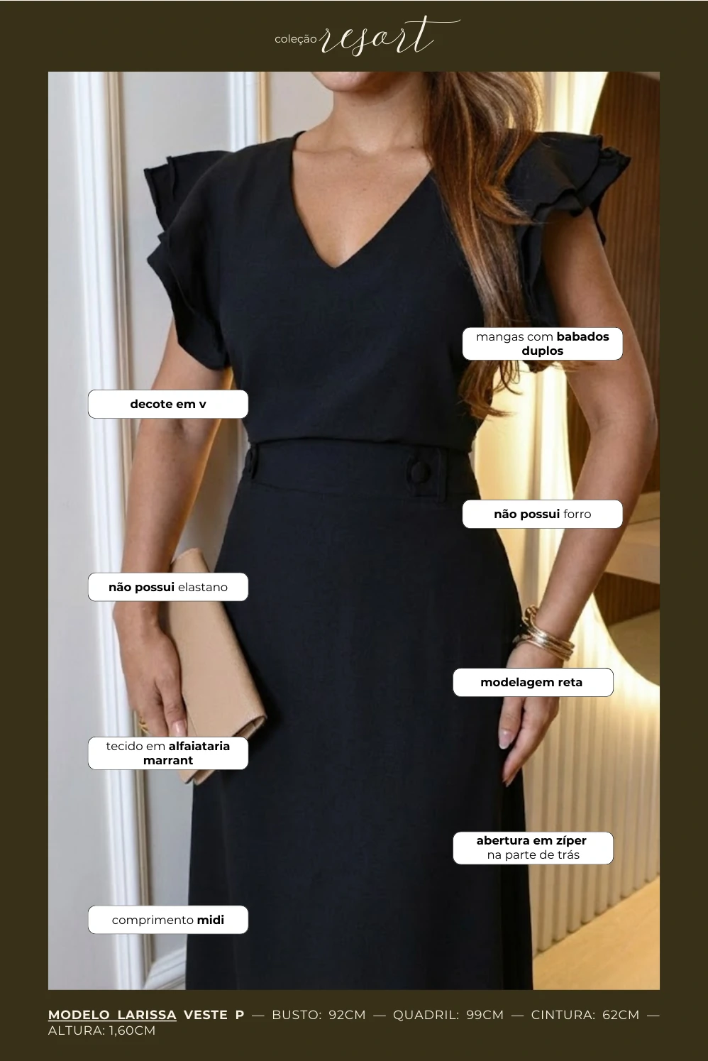 O conjunto é composto por uma blusa com decote em V e mangas com babados estruturados, que trazem movimento e um toque romântico ao visual. A saia midi em modelagem evasê alonga a silhueta e destaca a cintura através de lapelas decorativas que criam um efeito de cintura ainda mais marcada. O caimento fluido garante elegância natural e leveza ao caminhar.