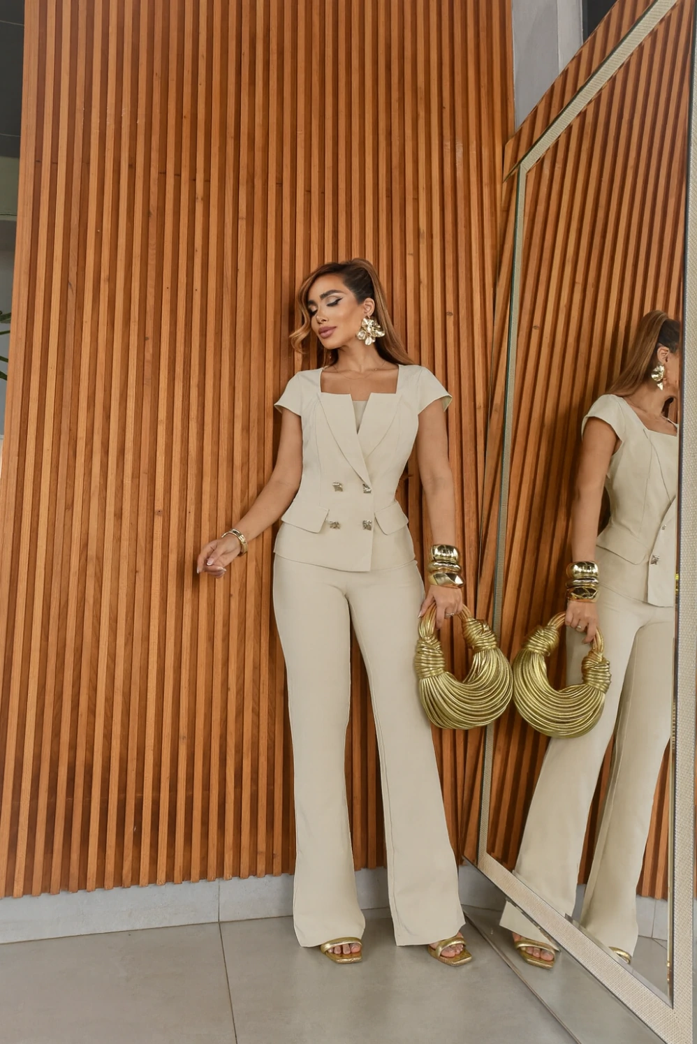 O conjunto apresenta uma blusa estruturada com decote quadrado, que valoriza o colo e alonga a silhueta. O recorte tipo blazer, com lapelas delicadas e abotoamento duplo decorativo, traz imponência e elegância imediata.