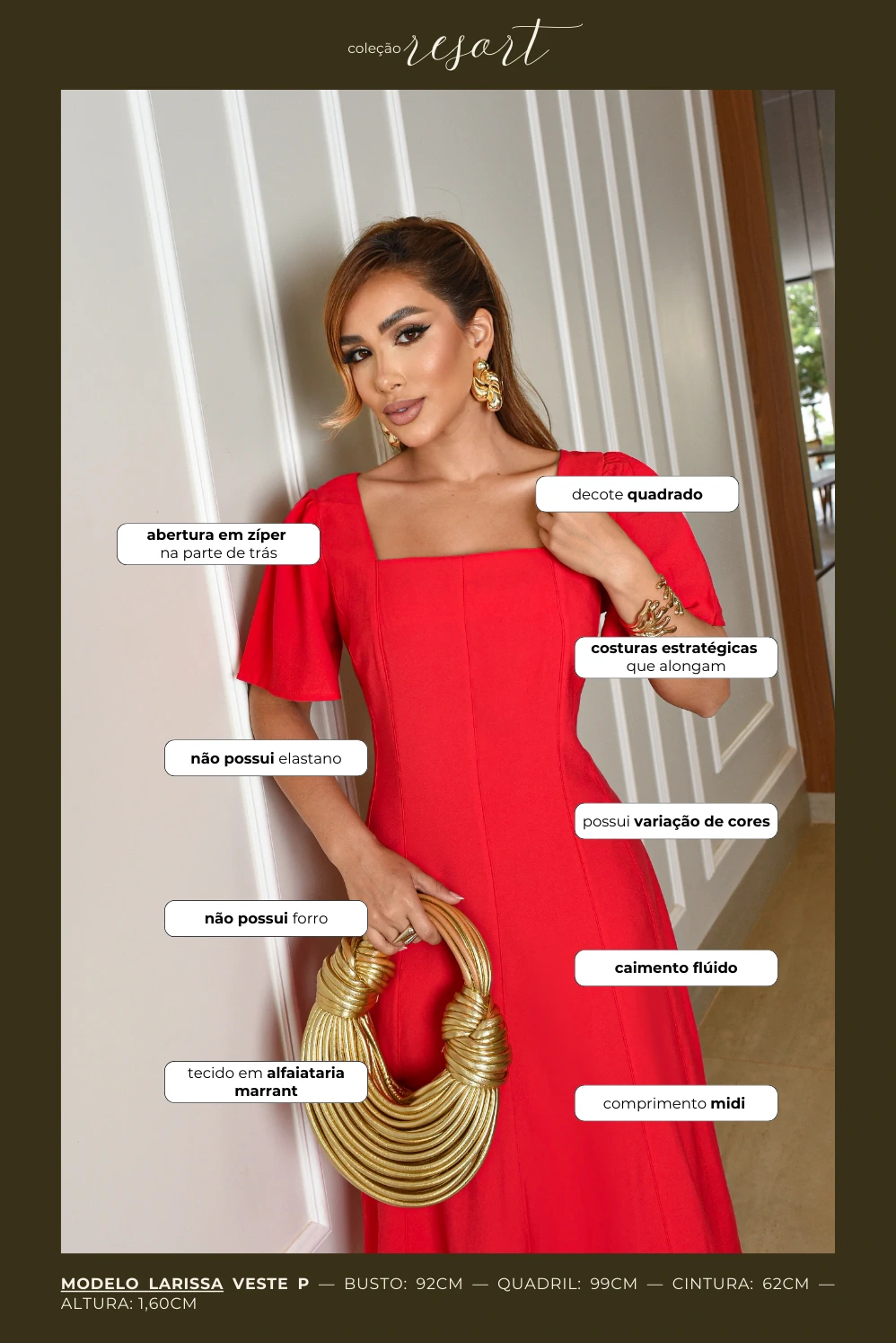 Com comprimento midi e cintura levemente marcada, o modelo alonga a silhueta de forma sutil. O decote quadrado emoldura o colo com doçura, enquanto as mangas curtas levemente bufantes acrescentam um toque romântico. A saia fluida garante movimento natural e uma presença graciosa.