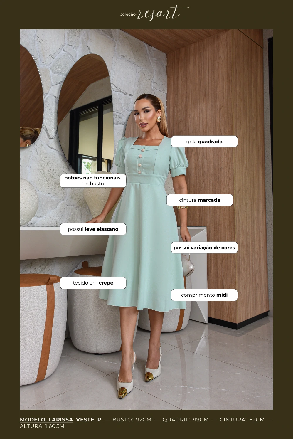 Modelagem acinturada, com saia evasê que proporciona movimento suave e elegante. Comprimento midi, valorizando a silhueta com feminilidade e equilíbrio.