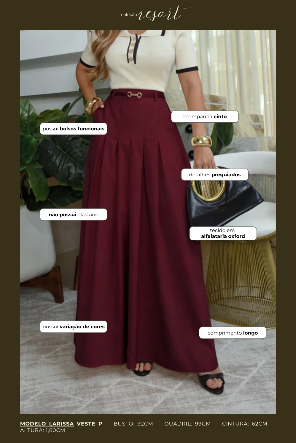 Saia com modelagem longa e ampla, que proporciona um caimento fluido e elegante. Possui cintura alta, valorizando a silhueta e alongando a linha do corpo.